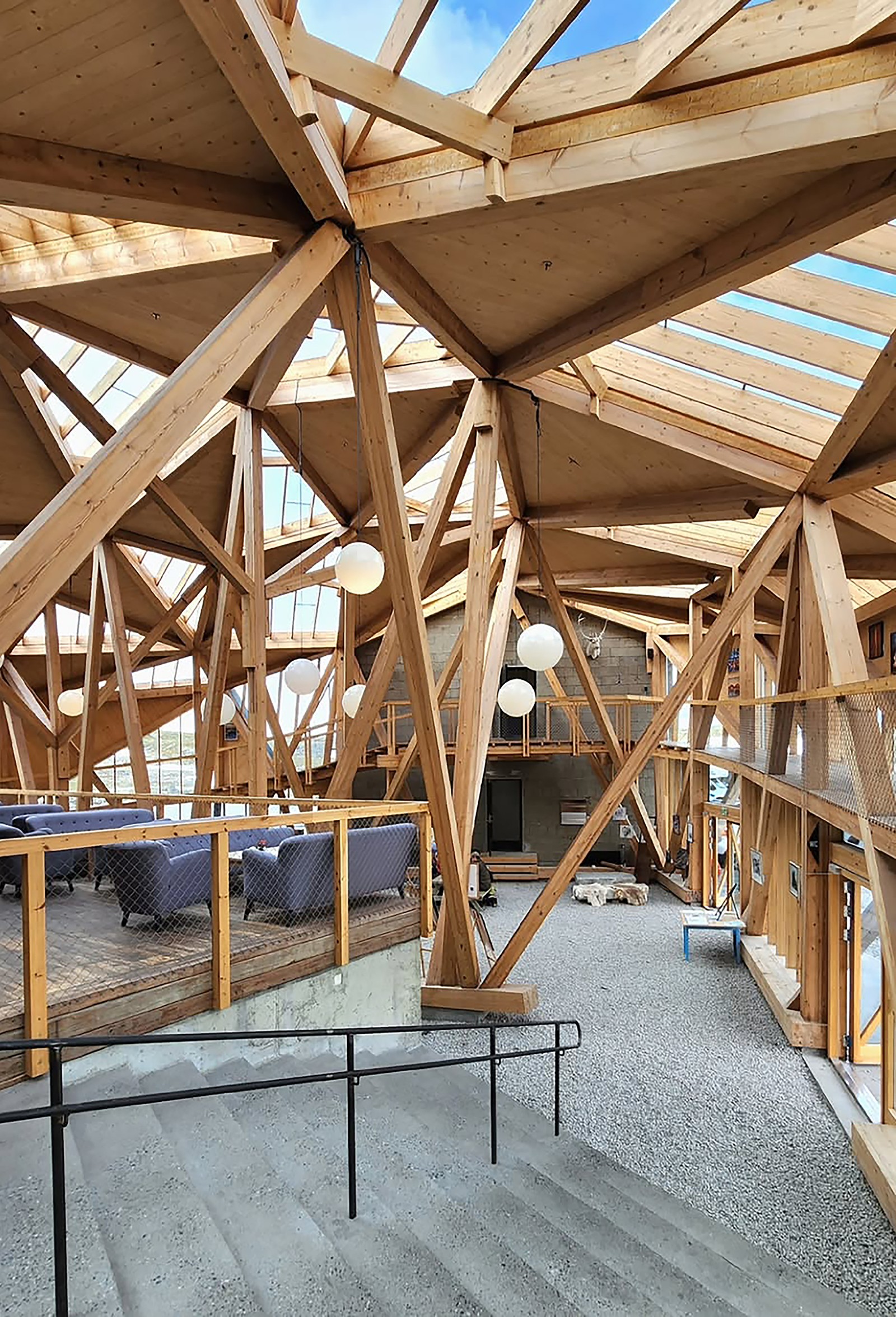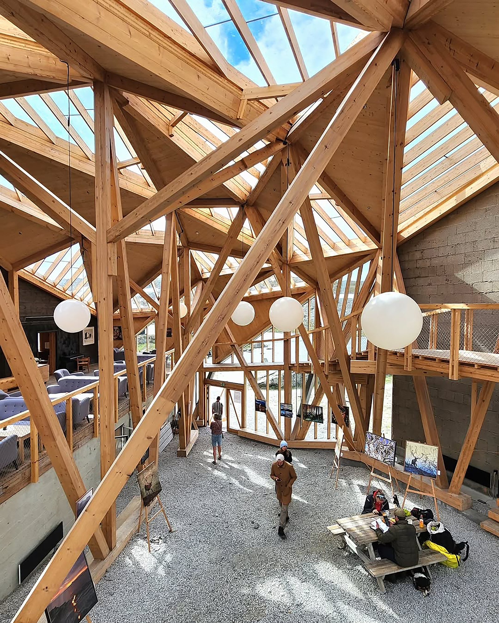 “건축은 자연의 질서를 읽어내어 그 위에 얇게 덧입혀야 한다”는 건축가의 철학은, 암반 위에 최소한의 기초를 두고 그 위로 목구조 모듈을 통째로 띄우는 방식으로 완성되었다. 그렇게 나무와 유리를 통해 경계를 지운 건축은 빛을 실내 전체로 분산시켜 고지대의 날씨와 빛의 분위기를 담는다. 대자연의 거친 공기와 시시각각 변하는 풍경, 한밤의 고요함이 건물의 얇은 껍질을 통과해 부드럽게 머물고, 우리의 존재는 서서히 자연 속으로 스며든다.