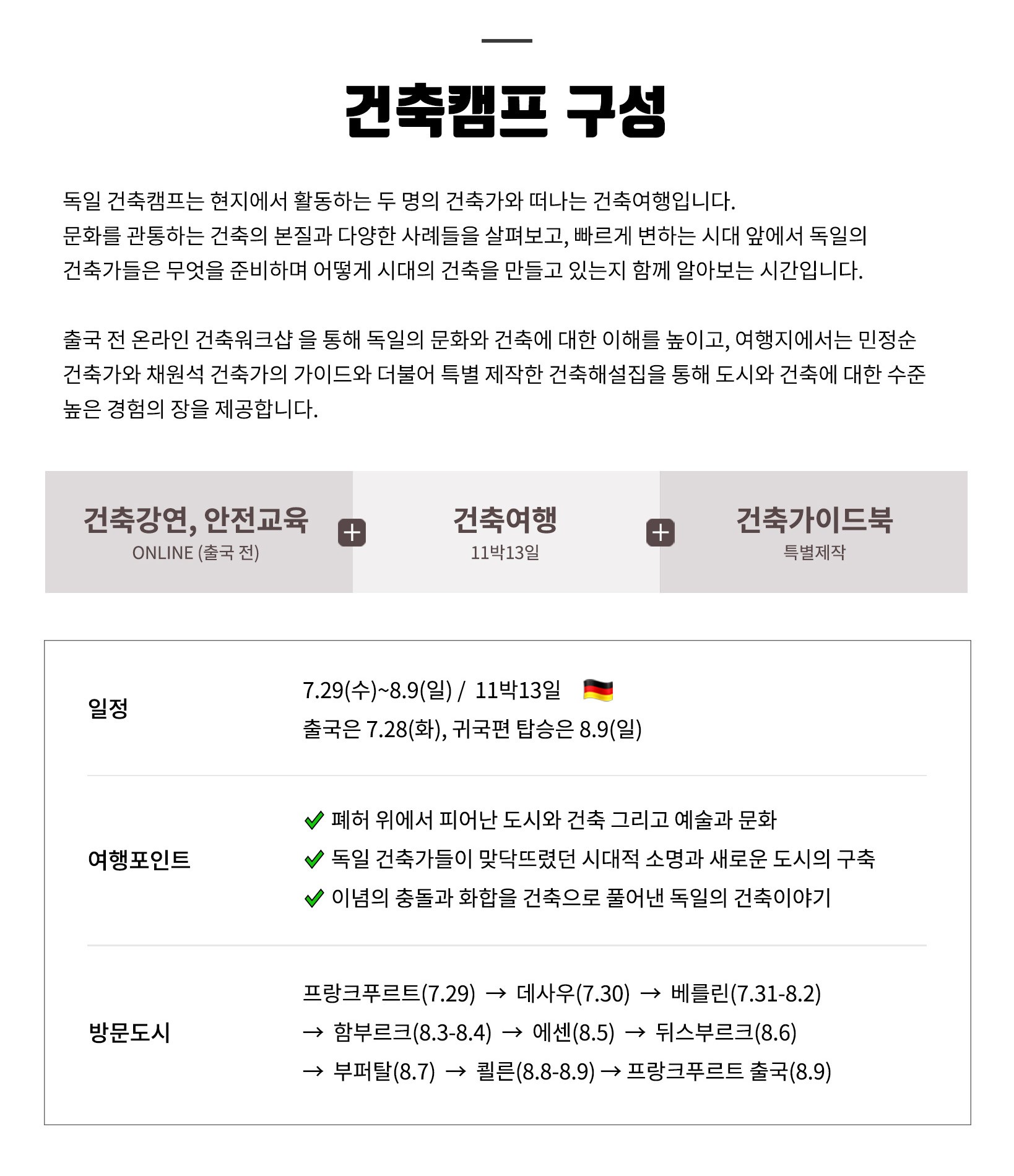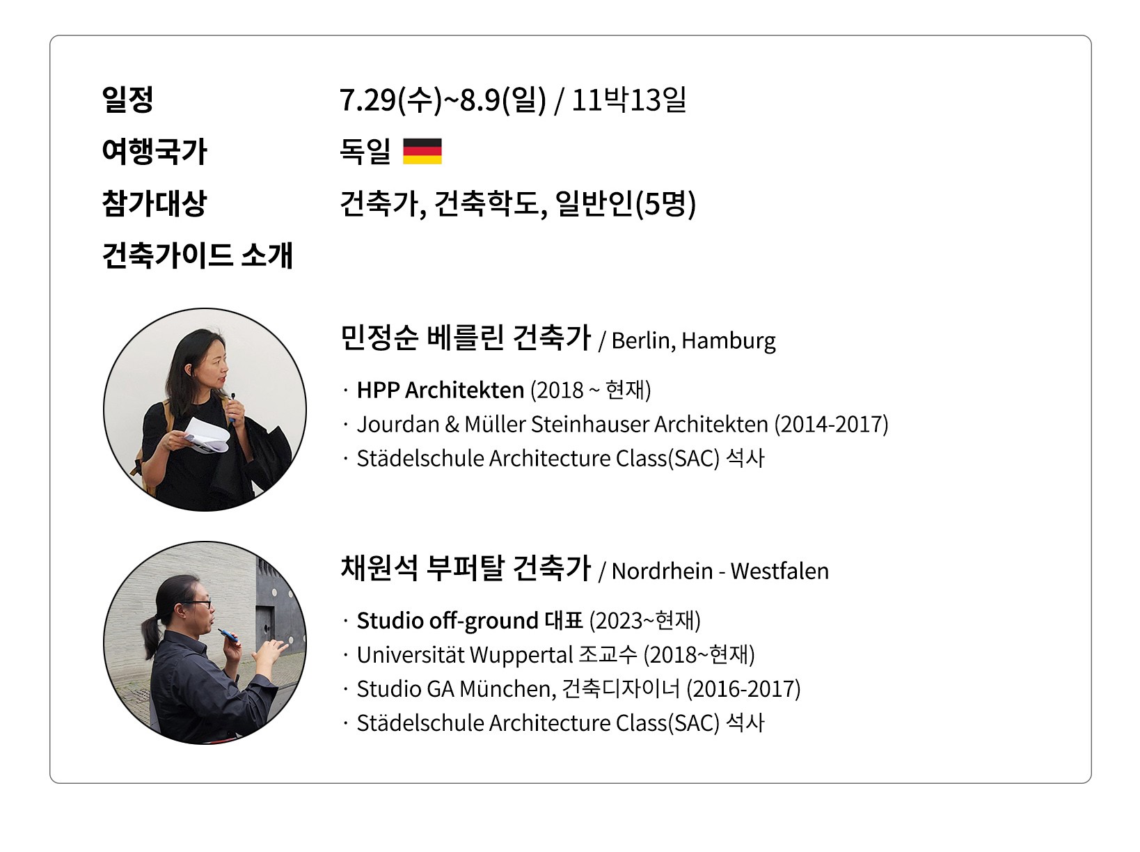 · 독일 건축가와 함께 '진짜' 독일 건축여행을 떠나고 싶은 분 · 건축의 최전선에서 현대 건축의 흐름과 변화를 직접 경험하고 싶은 분 · 도시문화를 경험하고, 건축에 제대로 몰입하고 싶은 분 · 건축이라는 길 앞에서 고민하고 주저하는 학생과 사회초년생들 · 혼자서는 할 수 없는 특별한 건축경험을 하고 싶은 분