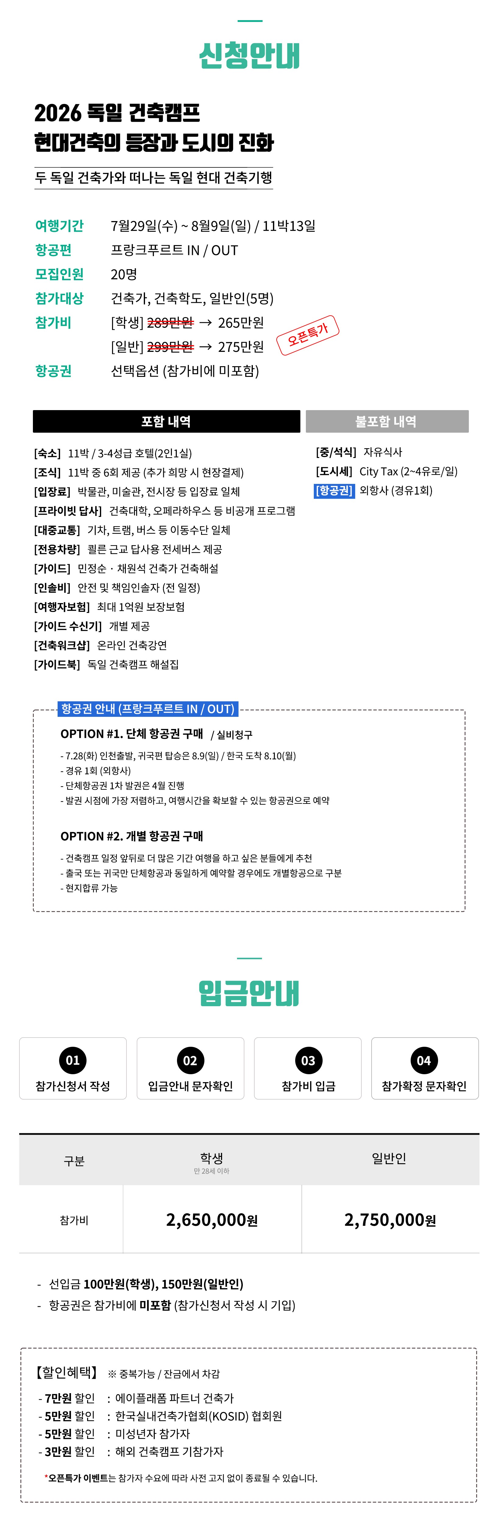 ① 밀도 높은 건축여행을 위해 참가자는 균형있게 구성합니다. ② 타인과 소통이 어렵거나 단체생활이 힘든 분은 참가가 어렵습니다. ③ 도시 간 이동은 기차와 전세버스를 이용합니다. ④ 도시 내 이동은 도보와 대중교통을 이용합니다. ⑤ 숙소는 호텔 2인1실 (트윈룸) ** 4성급 호텔 (8박), 3성급 호텔 (3박) ** 모든 호텔은 도시 중심에 위치 ⑥ 하루 일정은 오전 9시 시작해서 오후 6시 종료됩니다. ⑦ 최고의 건축경험을 위해 현지와 계속 소통하며, 프로그램은 일부 변경될 수 있습니다. ⑧ [체류일] 프랑크푸르트(1), 데싸우(1), 베를린(3), 함부르크(2), 에센(2), 부퍼탈(1), 쾰른(1)