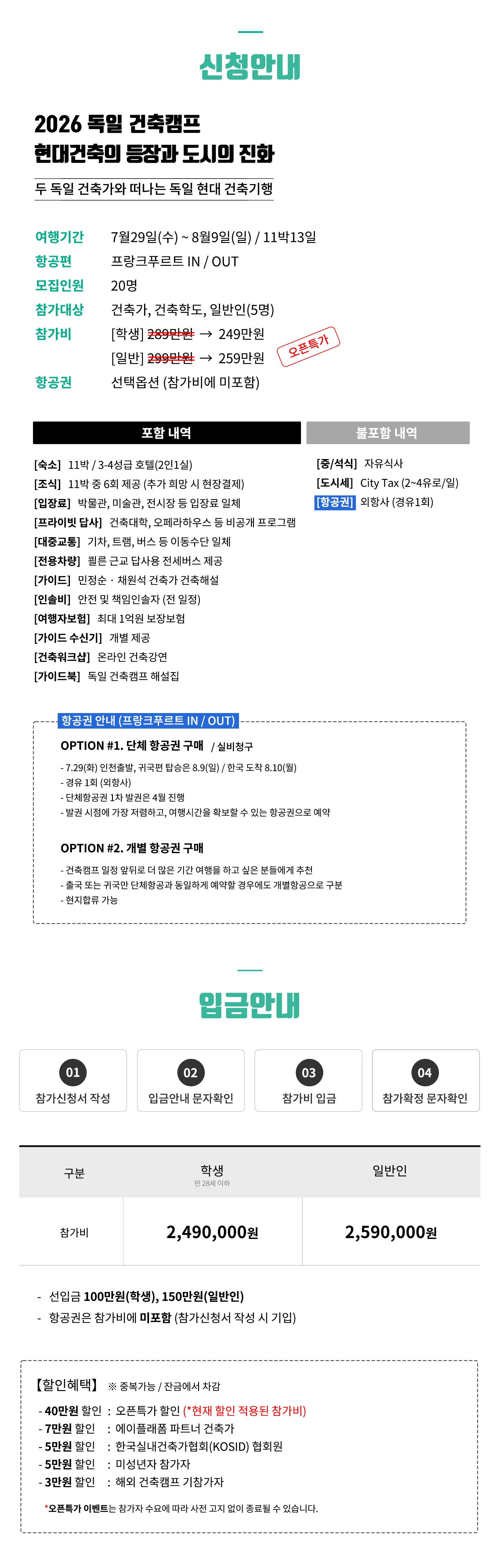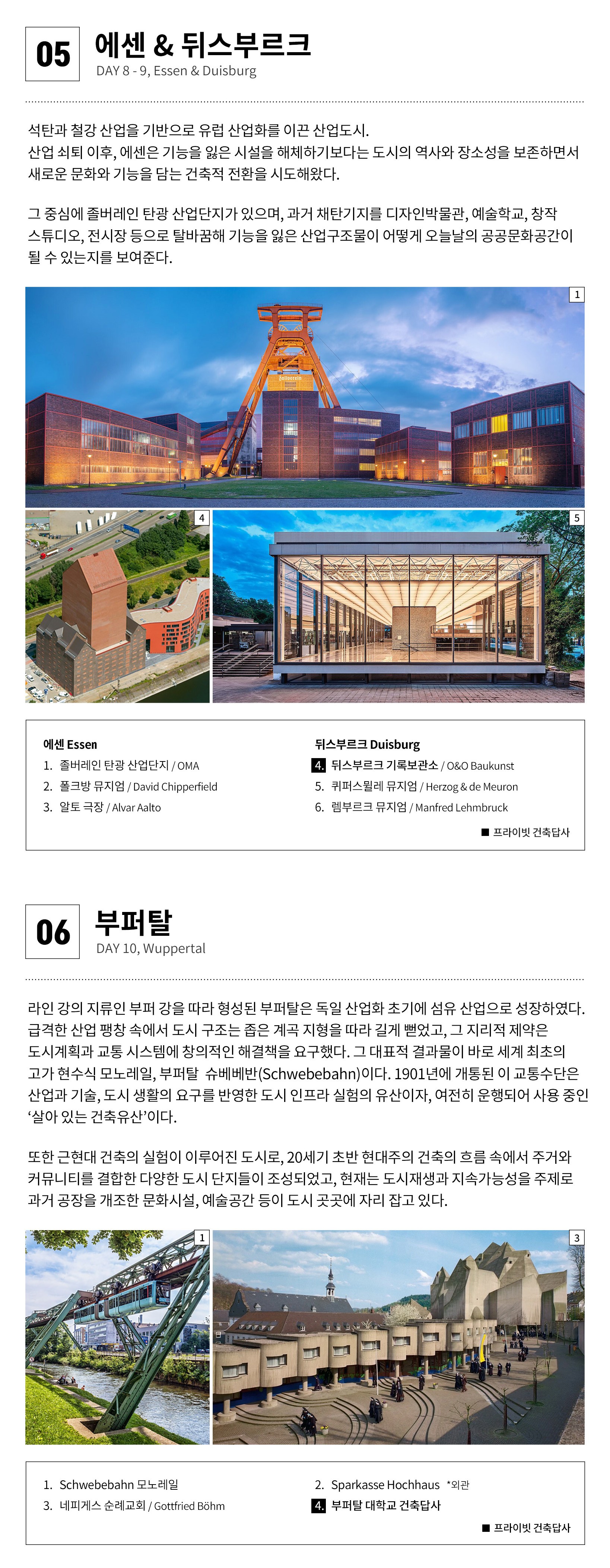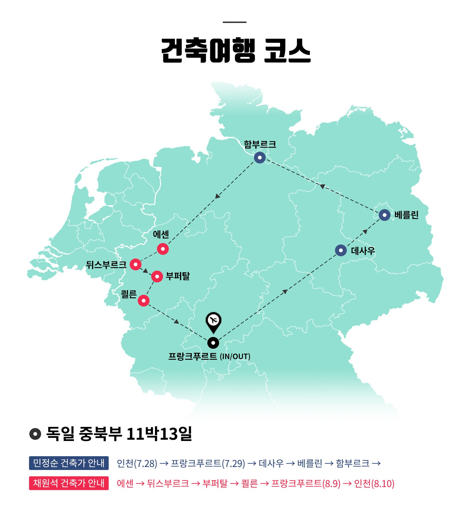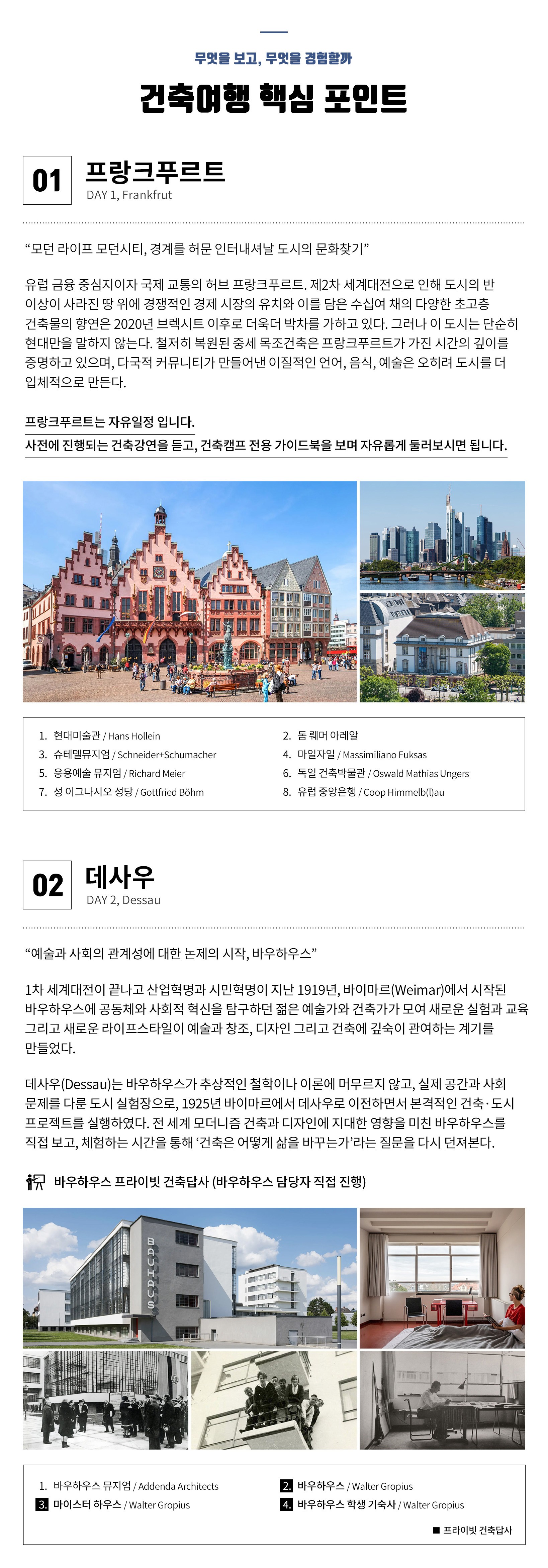 ① 밀도 높은 건축여행을 위해 참가자는 건축가 및 건축학도, 일반인으로 균형있게 구성합니다. ② 타인과 소통이 어렵거나 단체생활이 힘든 분은 참가가 어렵습니다. ③ 도시 간 이동은 기차와 전세버스를 이용합니다. ④ 도시 내 이동은 도보와 대중교통을 이용합니다. ⑤ 숙소는 호텔 2인1실 (트윈룸) ** 4성급 호텔 (8박), 3성급 호텔 (3박) ** 모든 호텔은 도시 중심에 위치 ⑥ 하루 일정은 오전 9시 시작해서 오후 6시 종료됩니다. ⑦ 최고의 건축경험을 위해 현지와 계속 소통하며, 프로그램은 일부 변경될 수 있습니다. ⑧ [체류일] 프랑크푸르트(1), 데싸우(1), 베를린(3), 함부르크(2), 에센(2), 부퍼탈(1), 쾰른(1)