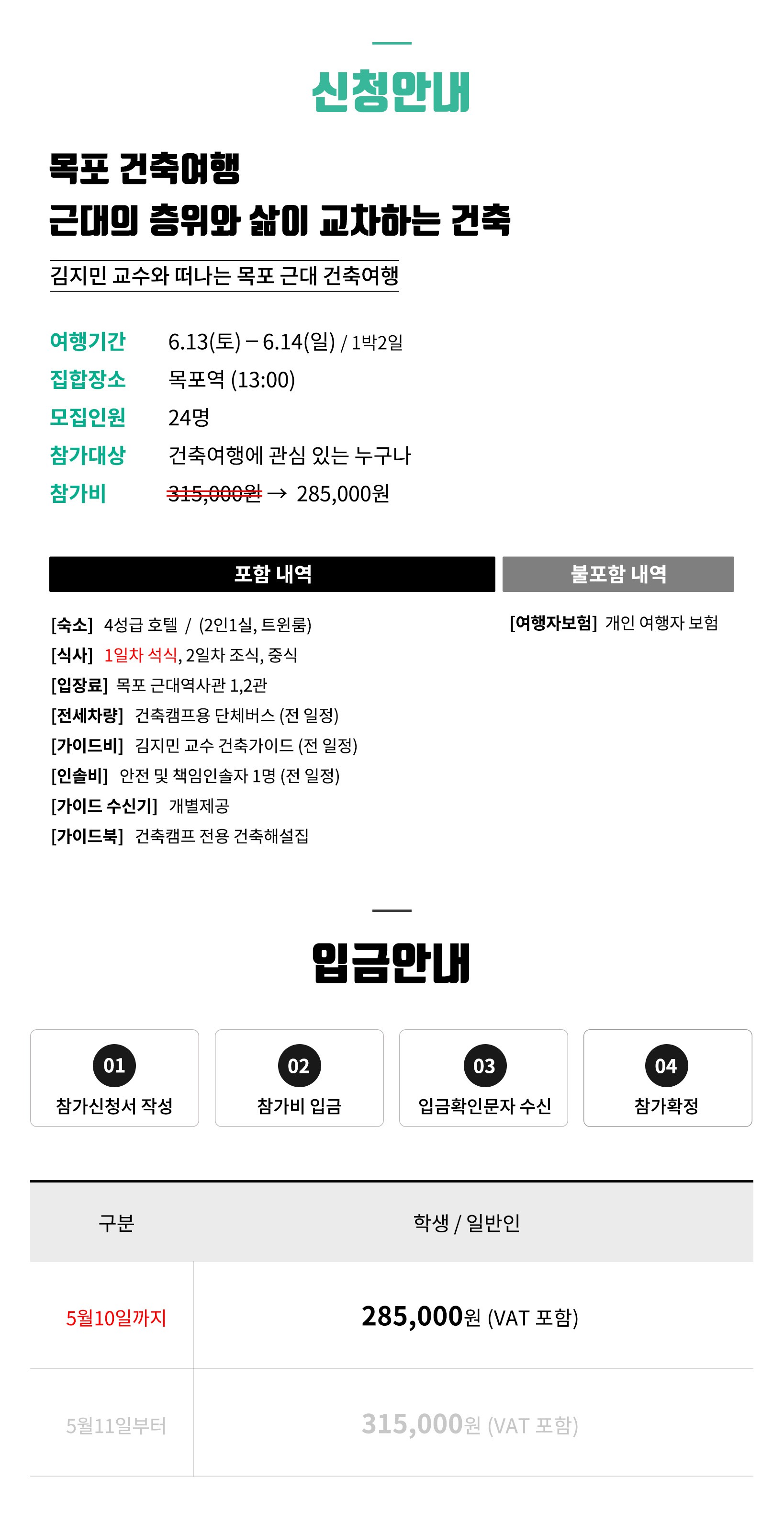 ① 전 일정 전세버스를 이용합니다. ② 호텔은 기본 2인1실 (1인실 업그레이드 4만원) ③ 행사 당일 날씨에 따라 일정은 일부 변경될 수 있습니다. ④ 물과 간단한 간식을 챙겨주세요. ⑤ 행사시작과 종료는 목포역입니다. ⑥ 여행 전 카카오톡 단체방이 개설됩니다.