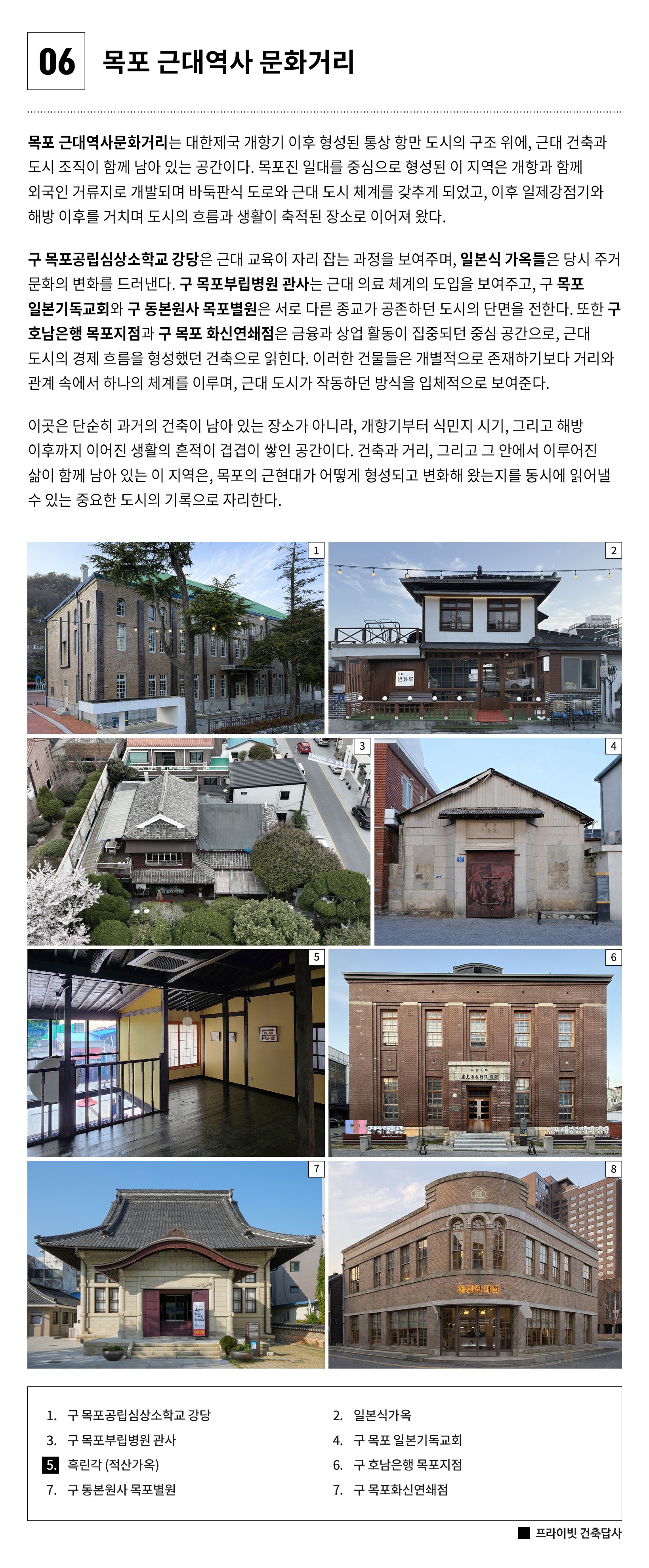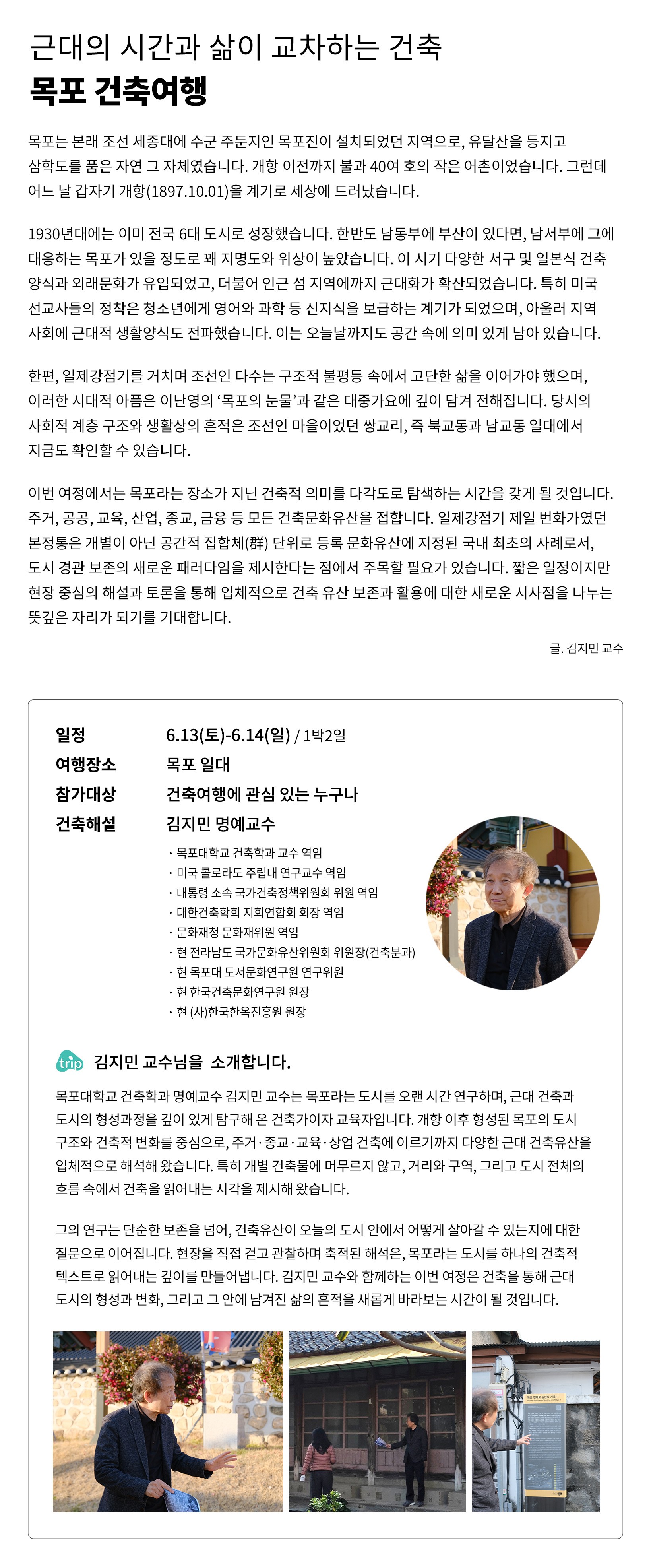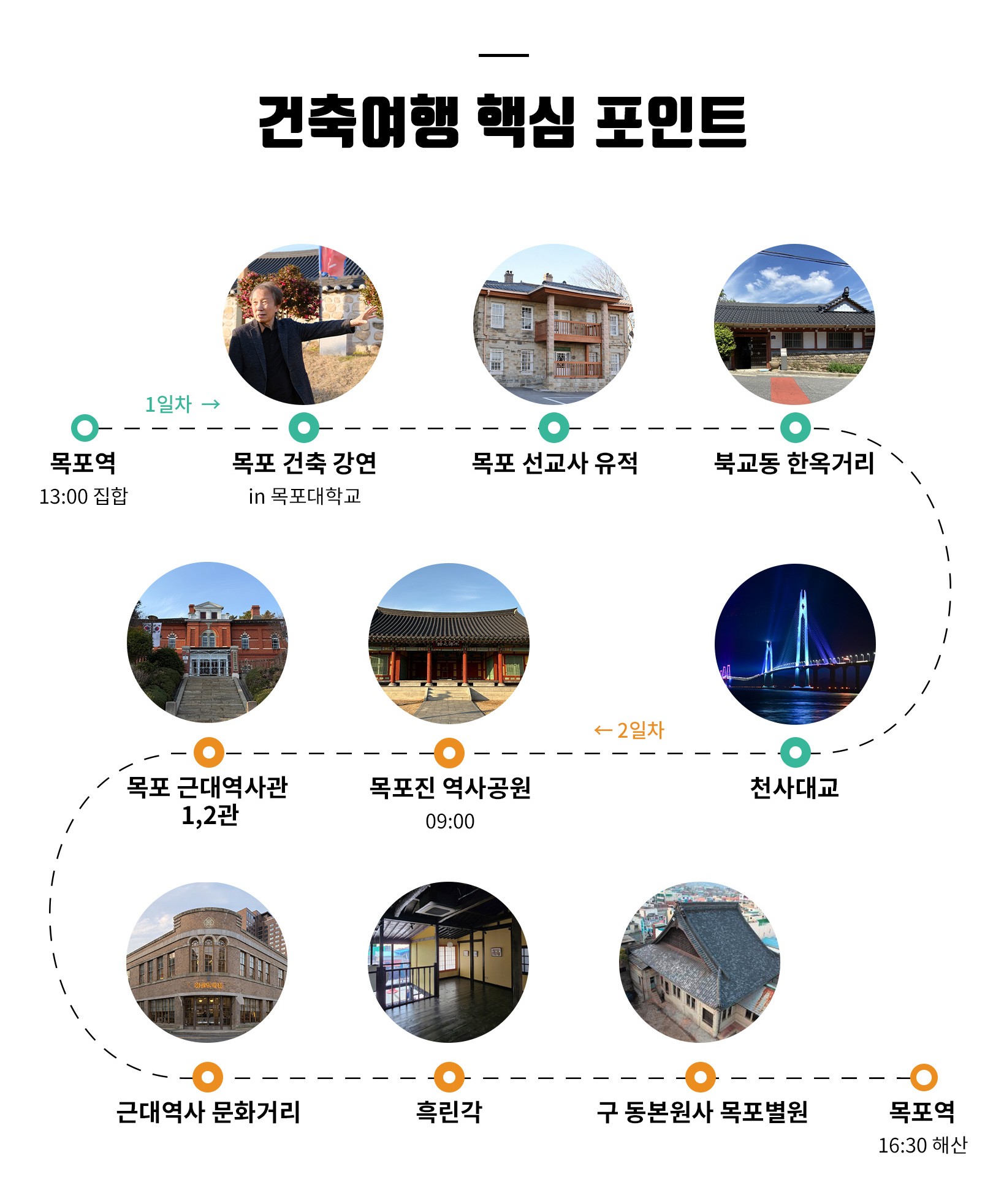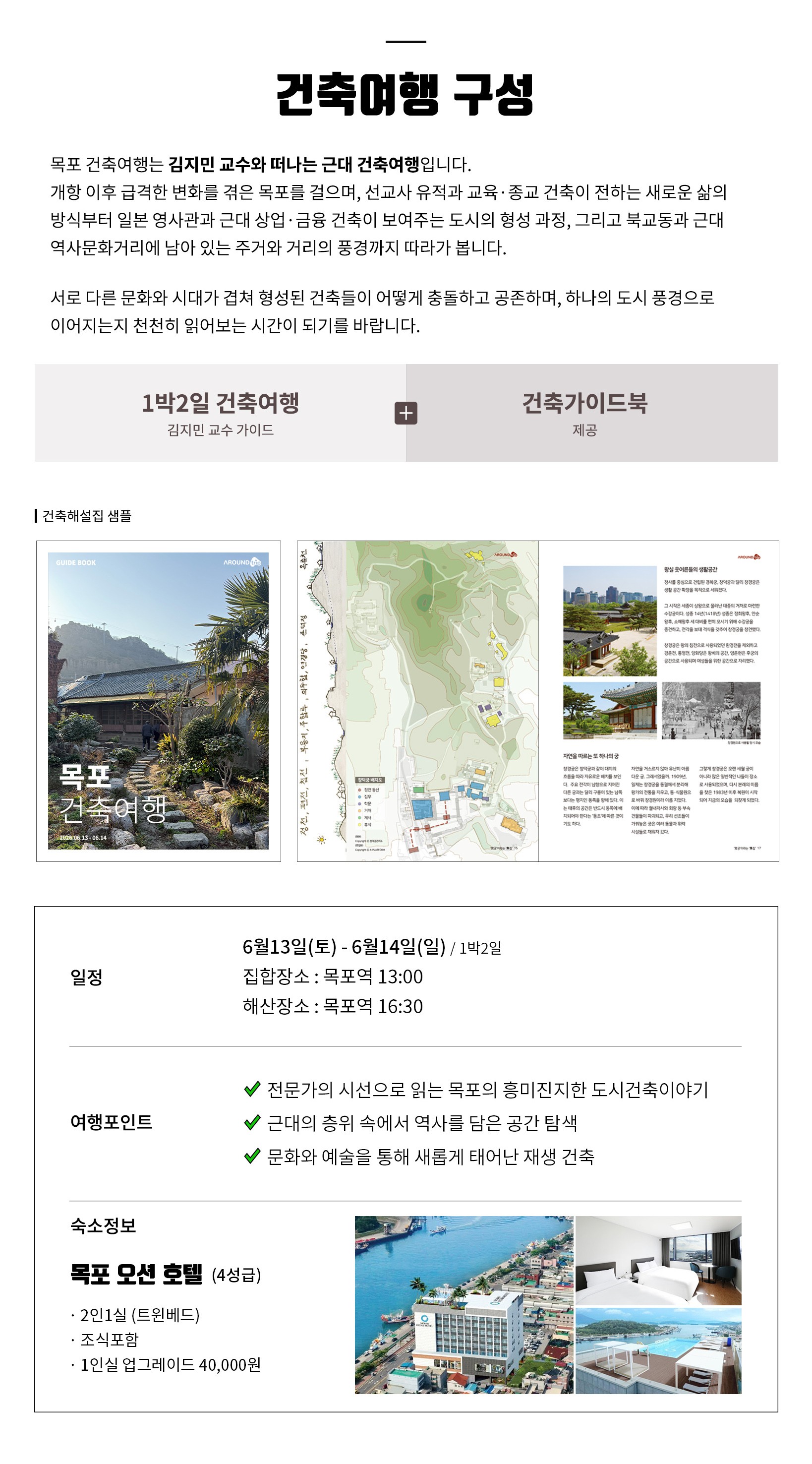 · 여행을 통해 건축적 감각과 도시를 바라보는 깊이를 확장하고 싶은 분 · 근대역사거리, 적산가옥, 항만도시구조 등 ‘시간의 흔적’을 건축과 함께 경험하고 싶은 분 · 목포라는 도시의 형성과 변화 과정 속에서 건축과 도시의 관계를 읽어보고 싶은 분 · 건축재생 사례를 통해 기존 건축을 어떻게 새롭게 활용할 수 있는지 인시이트를 얻고 싶은 분