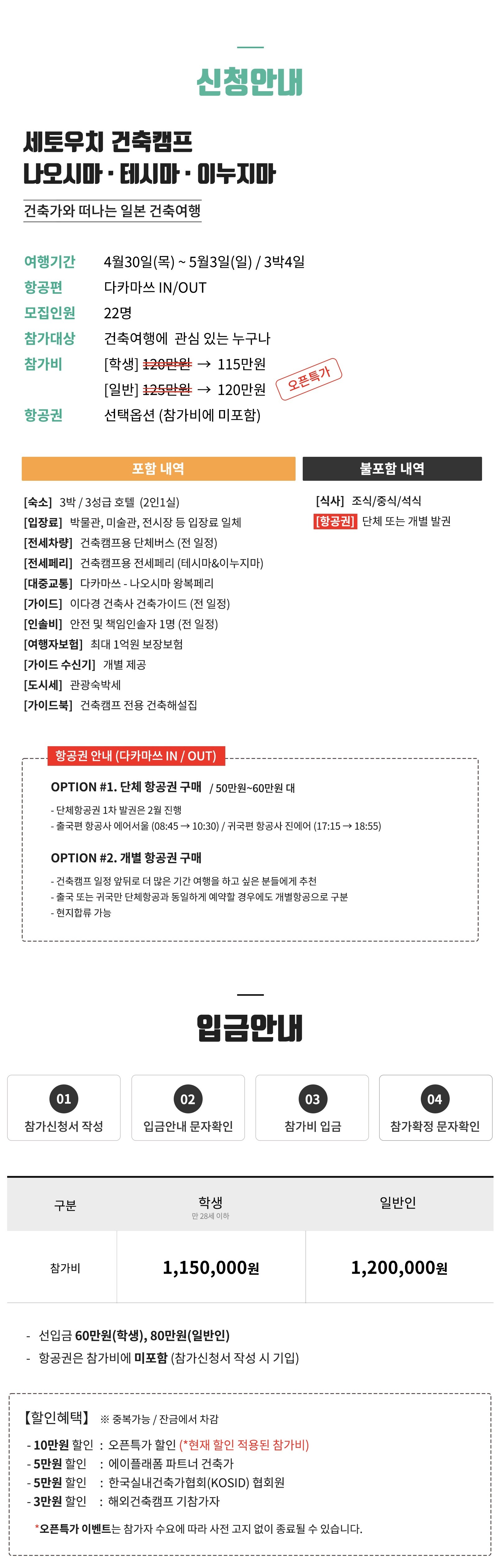 ① 최고의 건축경험을 제공하기 위해 프로그램은 일부 변경될 수 있습니다. ② 여행 전 카카오톡 단체방과 현지에서 안전교육 진행 ③ 숙소는 기본 2인1실 (1인실 업그레이드 20만원) ④ 조식 미포함 ⑤ 중식은 자유식사지만, 일정에 따라 답사지 주변에서 단체식사 예정 ⑥ 참가자 다양성을 위해 동행은 최대 6인으로 제한합니다. ⑦ 미성년자 참가가능 ⑧ 행사진행 최소 인원 5명