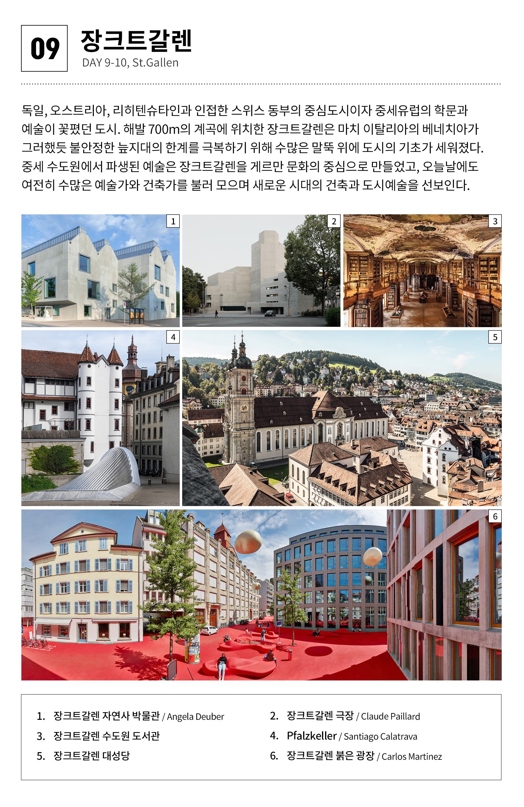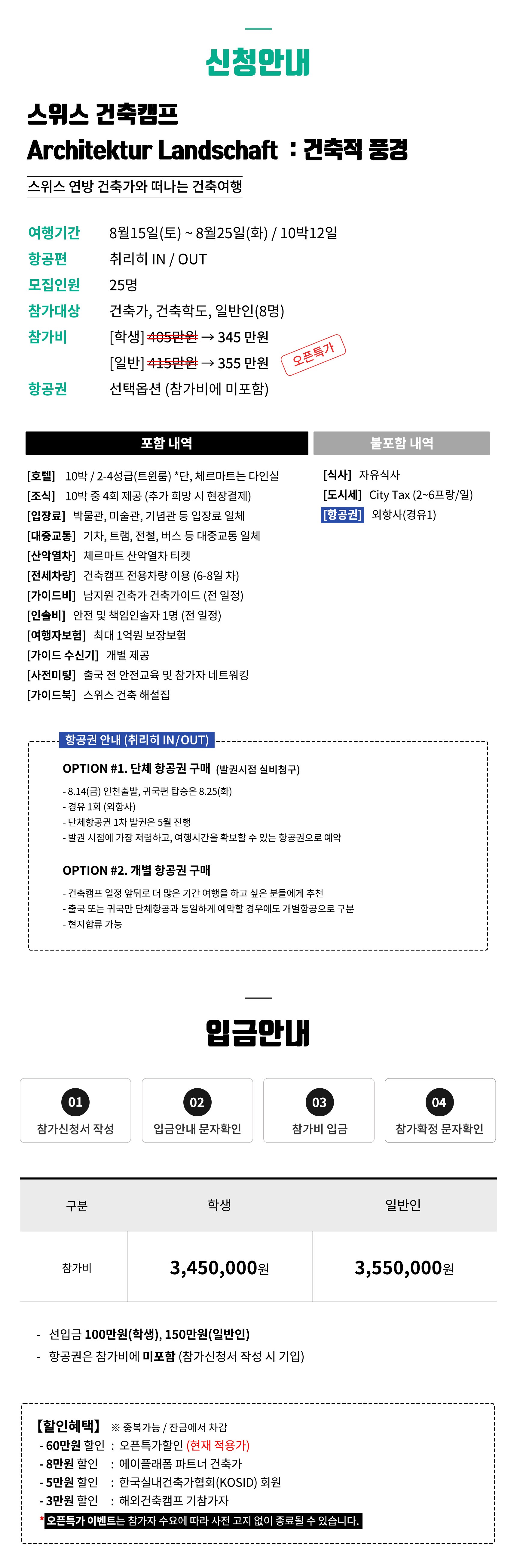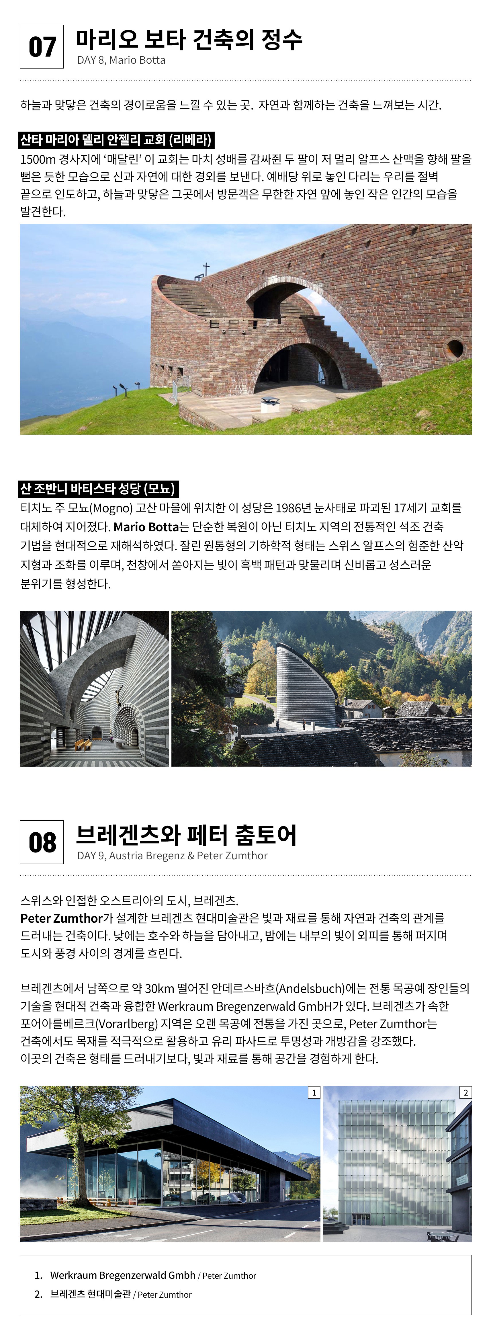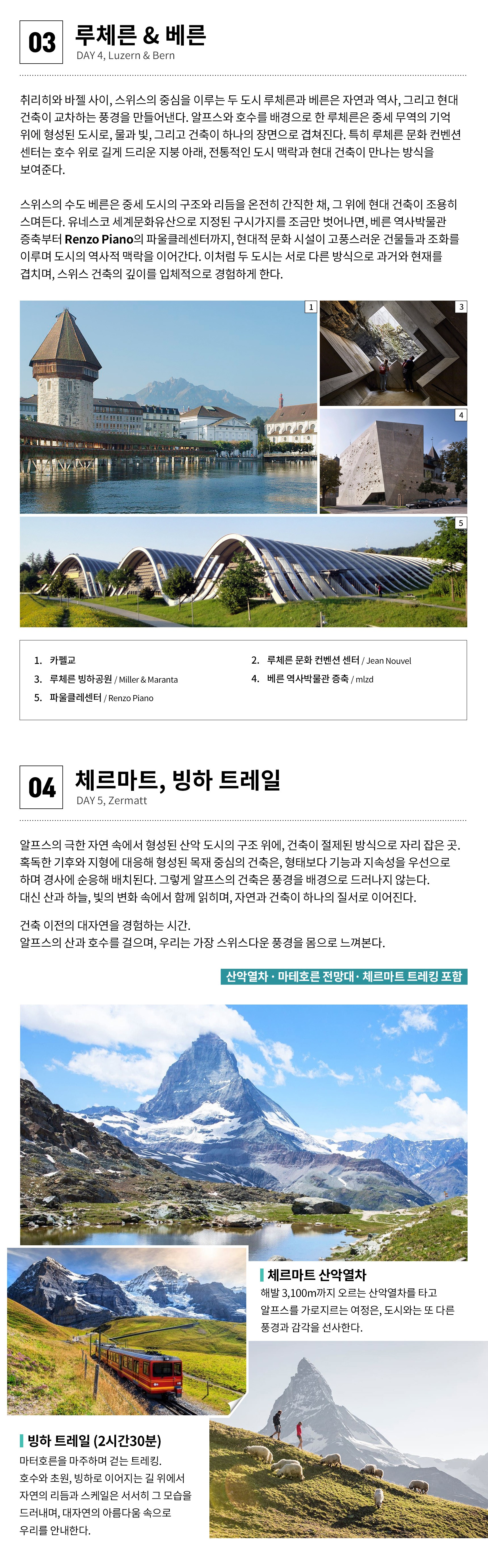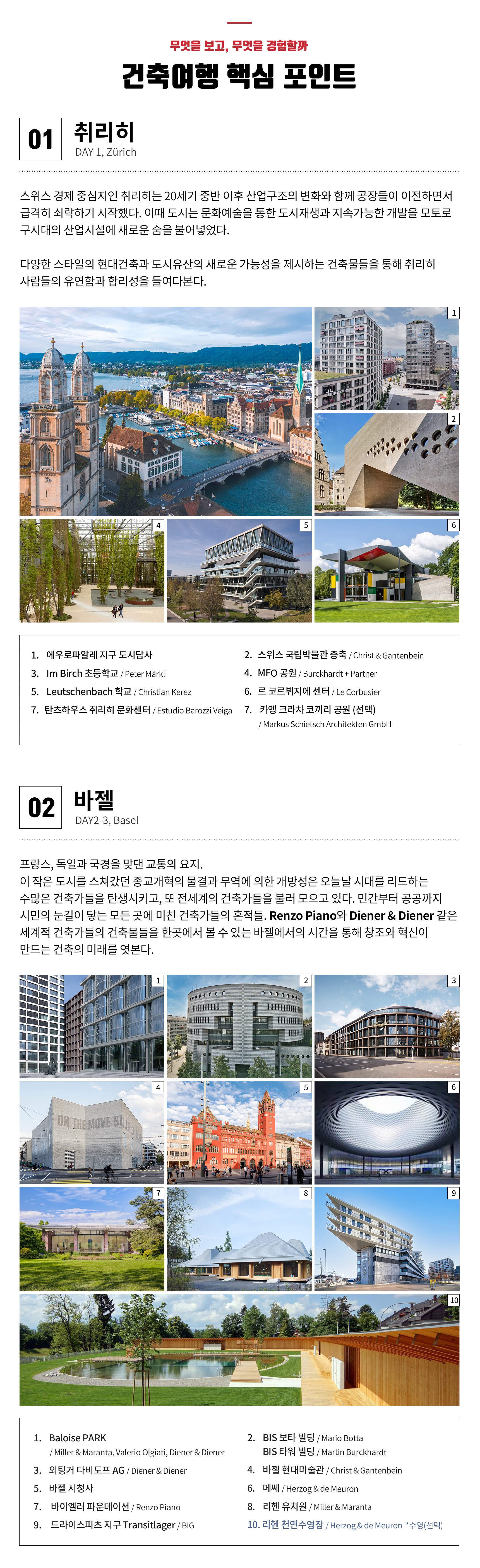 ① 본 행사는 건축가와 건축에 대한 기본지식을 필요로 합니다. (난이도 중) ② 단체생활이 힘든 분은 참가가 어렵습니다. ③ 도시 간 이동은 기차와 전세버스 이용 ④ 도시 내 이동은 도보와 대중교통 이용 ⑤ 최고의 건축경험을 위해 프로그램은 일부 변경될 수 있습니다. ⑥ 호텔은 2인1실 (트윈룸), 체르마트는 다인실 ⑦ [체류일] 바젤(3박), 베른(1박), 체르마트(1박), 벨린초나(2박), 상갈렌(1박), 취리히(2박) ⑧ 행사진행 최소 인원 12명 (출국 2개월 전까지) ■ 호텔정보 [바젤] Ibis Budget Basel City [베른] Hotel City am Bahnhof [체르마트] Zermatt Youth Hostel [벨린초나] Hotel Bellinzona Sud Swiss Quality [상갈렌] B&B HOTEL St Gallen (3성급) [취리히] Radisson Hotel & Suites Zurich (4성급)