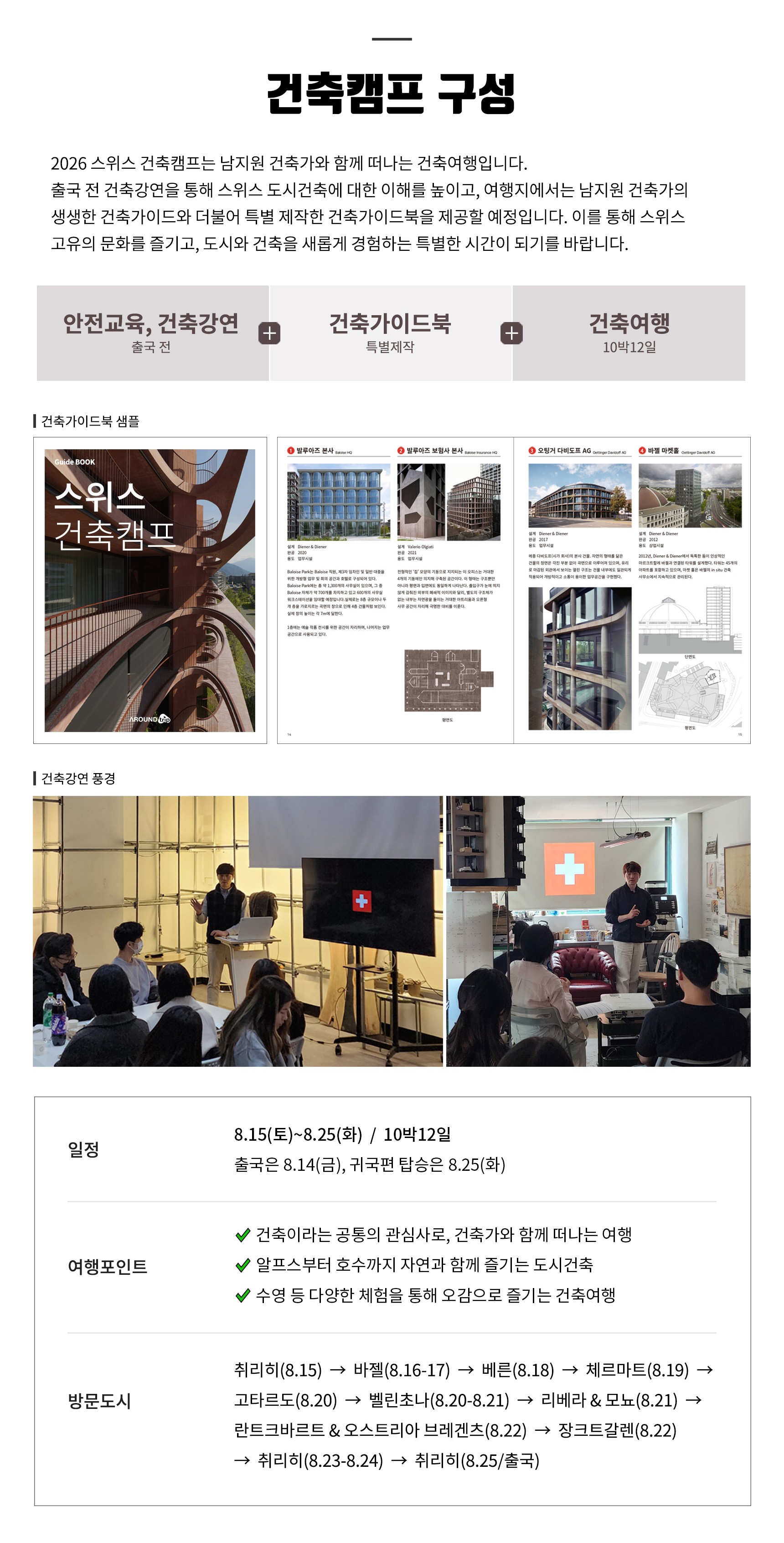 · 스위스 연방 건축가와 함께 ‘진짜’ 건축여행을 떠나고 싶은 분 · 알프스에서 태동한 문화와 건축을 온전히 경험하고 싶은 분 · 건축에 몰입해 도시와 건축을 제대로 배우고 싶은 분 · 현대 건축의 원리를 이해하고, 공간을 읽는 눈을 기르고 싶은 분 · 대자연과 공존하는 건축을 직접 경험하고 싶은 분