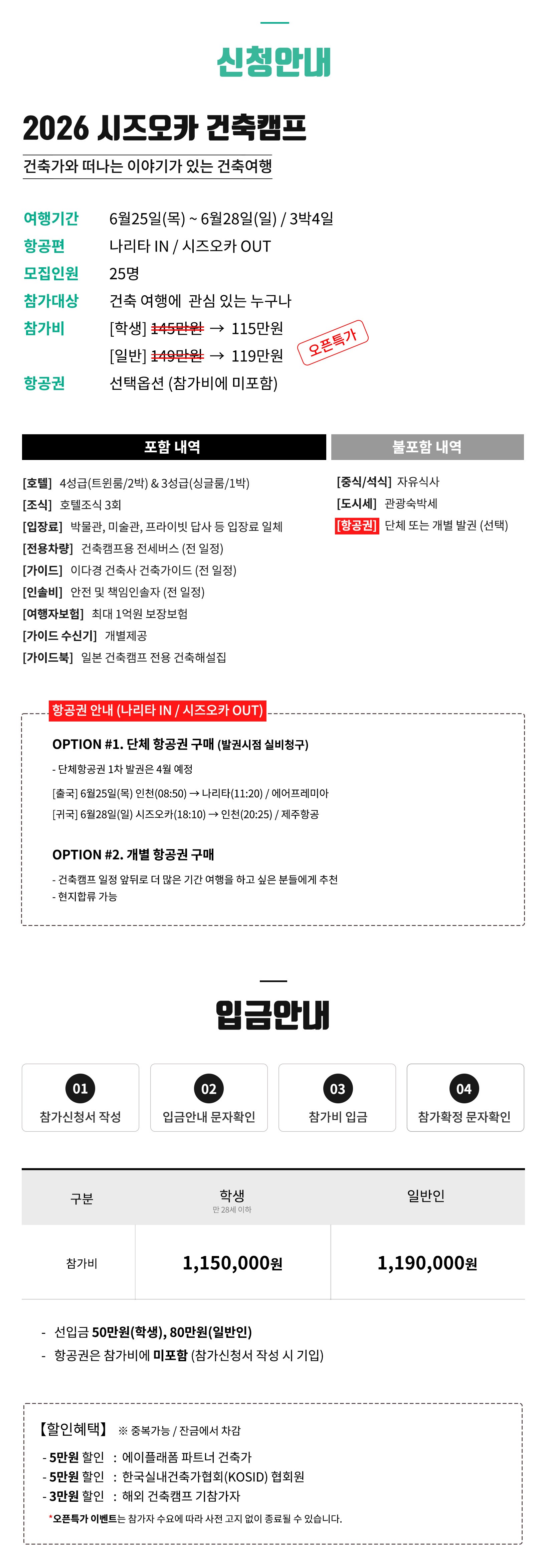 ① 최고의 건축경험을 제공하기 위해 프로그램은 일부 변경될 수 있습니다. ② 여행 전 카카오톡 단체방과 현지에서 지속적인 안전교육 진행 ③ 숙소는 기본 2인1실(트윈룸) ④ 미성년자 참가가능 ⑤ 중식은 자유식사지만, 일정에 따라 답사지 주변에서 단체식사 예정 ⑥ 행사진행 최소 인원 5명 ⑦ 하루 일정은 오전 8시30분 시작, 오후 6시 종료 (이후 자유시간) ⑧ 전 일정 전세버스를 탑승합니다.
