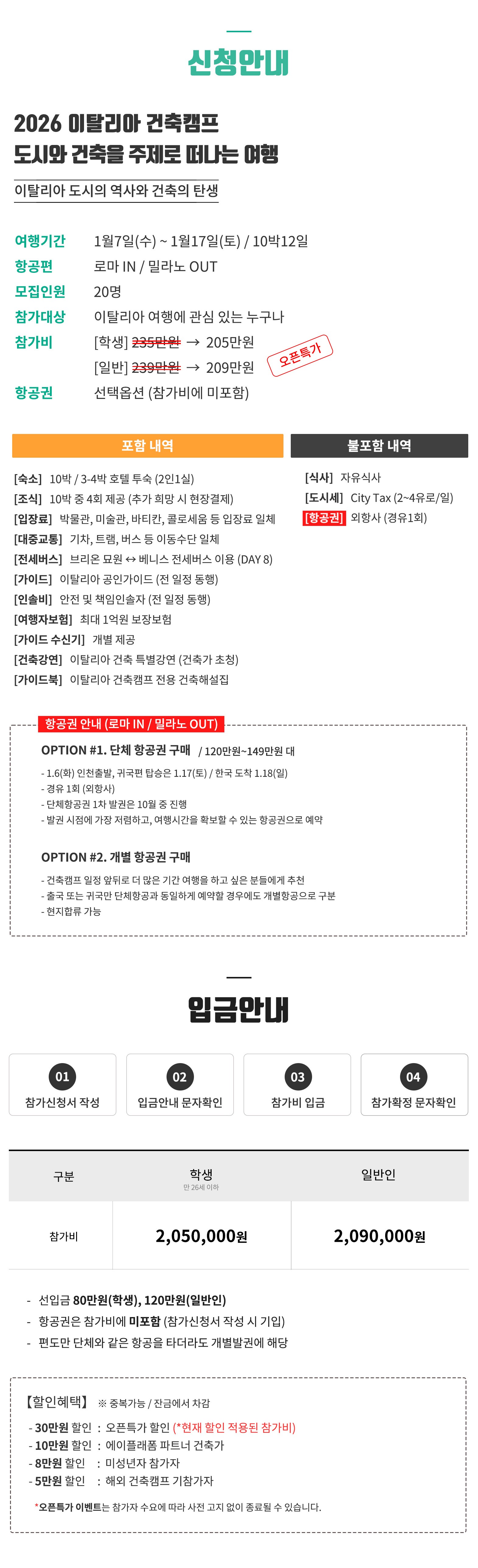 ① 건축캠프는 도시를 걷고, 골목을 탐색하며, 도시 고유의 분위기와 건축을 경험하는 여행입니다. ② 타인과 소통이 어렵거나 단체생활이 힘든 분은 참가가 어렵습니다. ③ 도시 간 이동은 기차를 이용합니다. (시에나 구간은 버스) ④ 숙소는 호텔 2인1실(트윈베드) 제공 ⑤ 하루 일정은 오전 9시부터 오후 6시까지 진행. 이후 자유시간 ■ 호텔정보 · 로마 (3박): Augusta Lucilla Palace Hotel (4성급) · 시에나 (1박): NH Siena (4성급) · 피렌체 (2박): Plus Florence Hostel (3성급) · 베니스 (3박): CAMPANILE VENICE MESTRE (3성급) · 밀라노 (1박): B&B Hotel Milano Aosta (3성급)