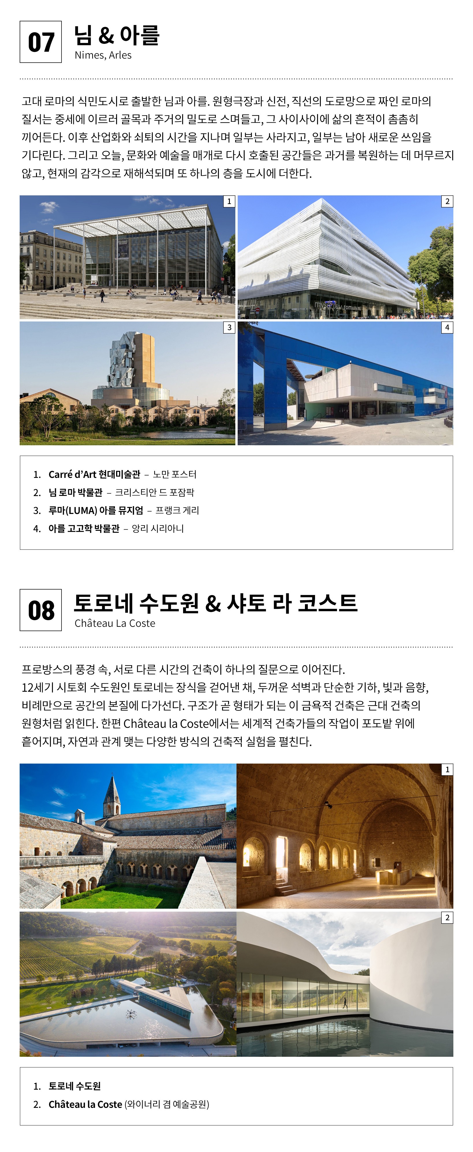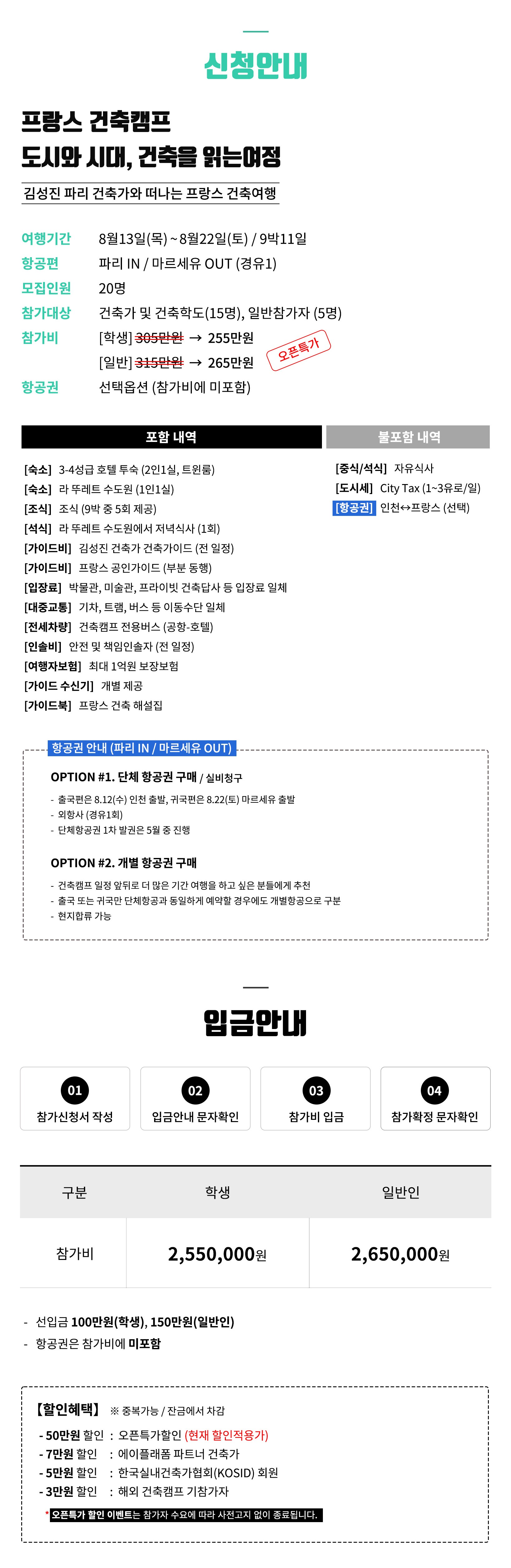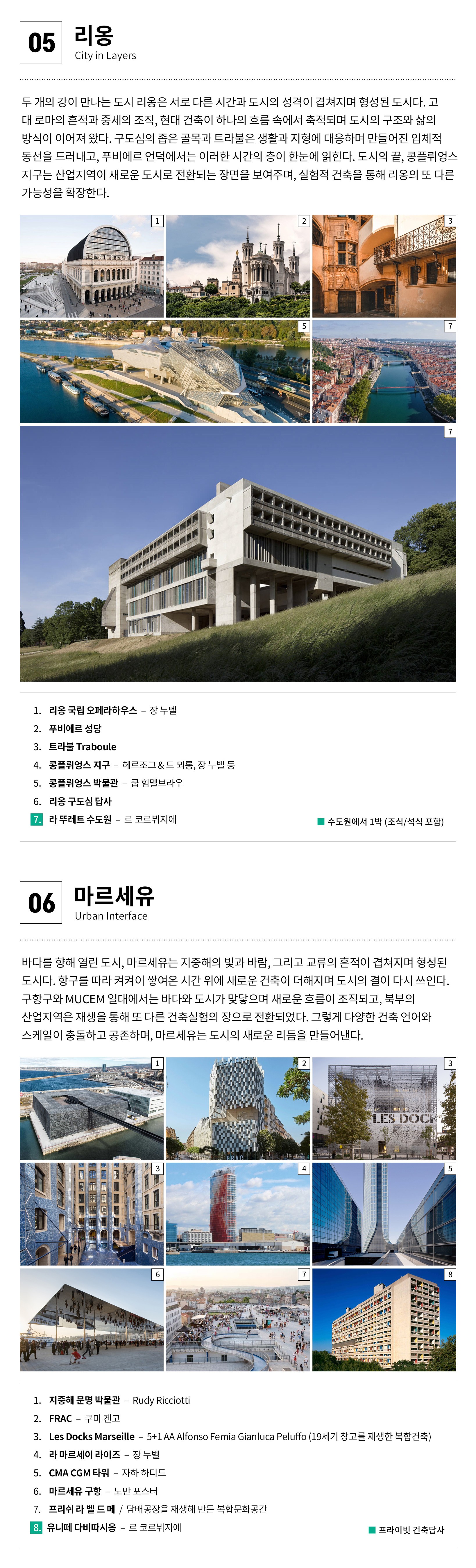 ① 본 여행은 참가자간의 대화와 공감이 중요하며, 지속적인 건축토론과 답사가 병행됩니다. ② 단체생활이 힘든 분은 참가가 어렵습니다. ③ 도시 간 이동은 기차와 전세버스를 이용합니다. ④ 도시 내 이동은 도보와 대중교통을 이용합니다. ⑤ 호텔은 2인1실 (트윈룸), 라 투레트는 1인실 ** 모든 호텔은 도시 중심에 위치 ⑥ 최고의 건축경험을 위해 프로그램은 일부 변경될 수 있습니다. ⑦ [체류일] 파리(4박), 리옹(1박), 라뚜레트(1박), 마르세유(2박), 아를(1박)