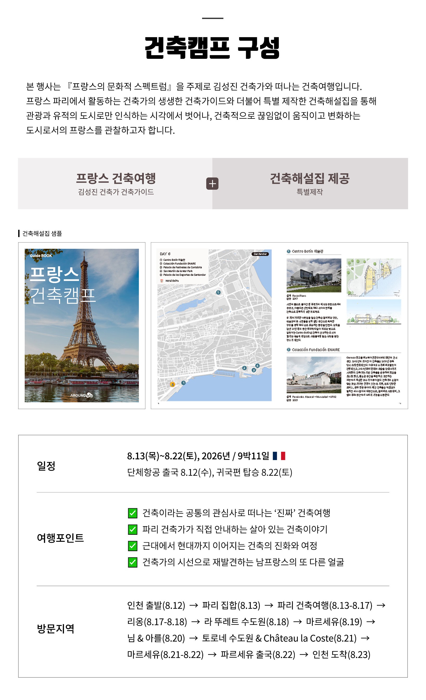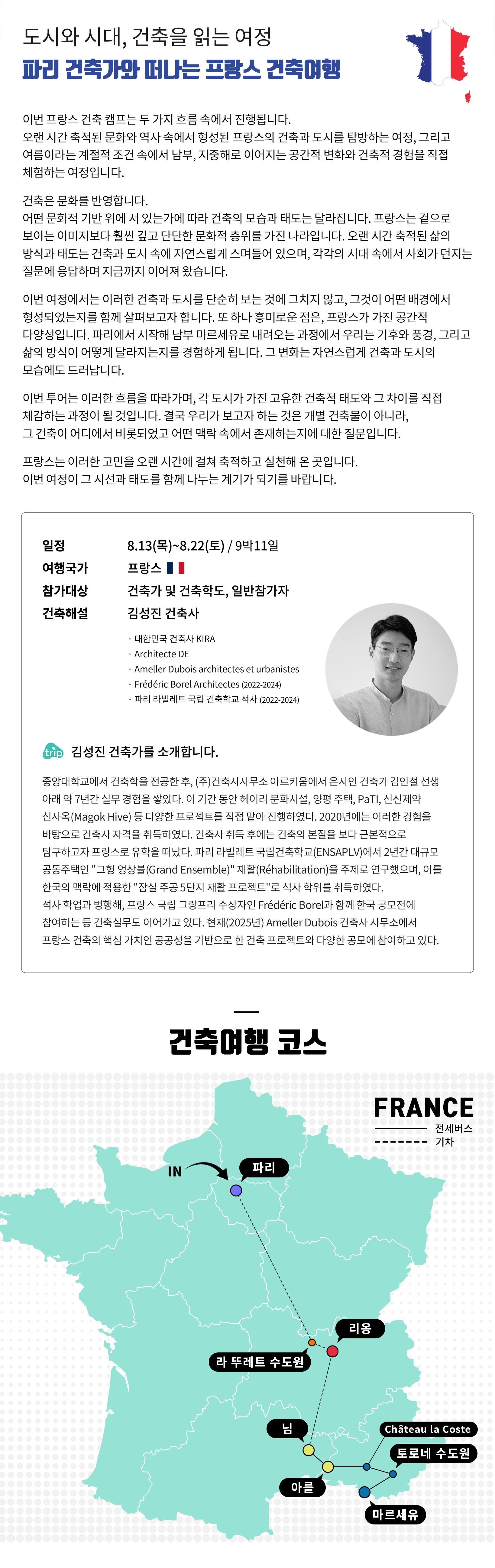 · 건축가와 함께 '진짜' 프랑스 건축여행을 떠나고 싶은 분 · 현대 건축의 흐름과 변화를 직접 경험하고 싶은 분 · 프랑스 도시문화를 경험하고, 공간을 읽는 눈을 기르고 싶은 분 · 건축이라는 길 앞에서 고민하고 주저하는 학생과 사회초년생들 · 형상 이면에 숨은 건축의 원리와 건축가의 언어를 이해하고 싶은 분