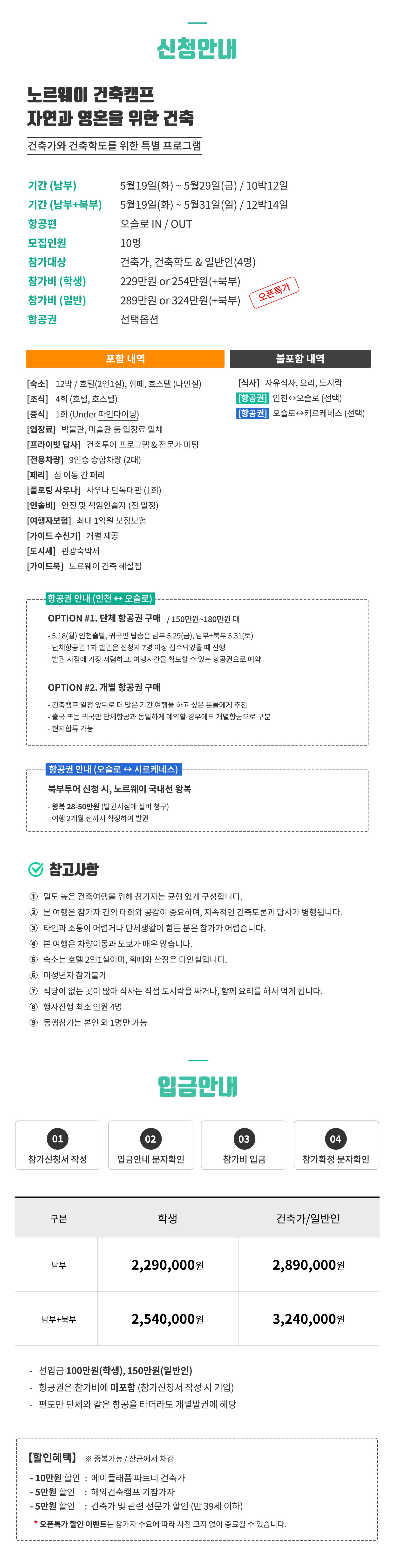 ① 밀도 높은 여행을 위해 참가자는 균형있게 구성합니다 ② 본 여행은 참가자 간의 대화와 공감이 중요하며, 지속적인 건축토론과 답사가 병행됩니다. ③ 타인과 소통이 어렵거나 단체생활이 힘든 분은 참가가 어렵습니다. ④ 본 여행은 차량이동과 도보가 매우 많습니다. ⑤ 숙소는 호텔 2인1실이며, 휘떼와 산장은 다인실입니다. ⑥ 미성년자 참가불가 ⑦ 식당이 없는 곳이 많아 식사는 직접 도시락을 싸거나, 함께 요리를 해서 먹게 됩니다. ⑧ 행사진행 최소 인원 4명 ⑨ 동행참가는 본인 외 1명만 가능